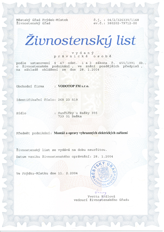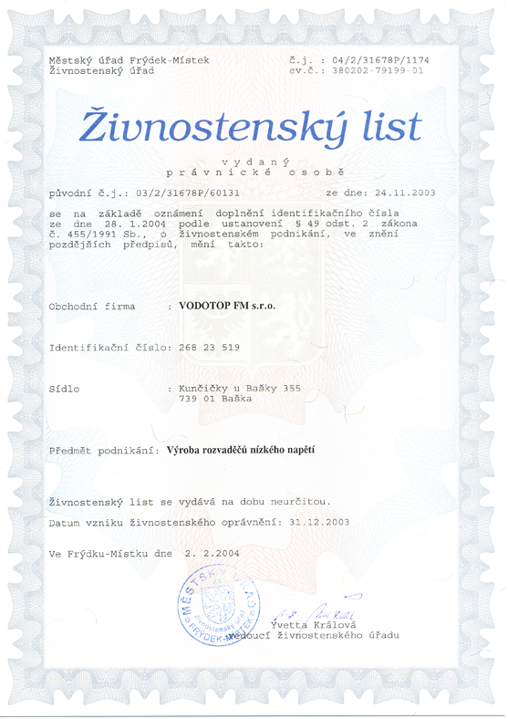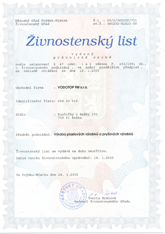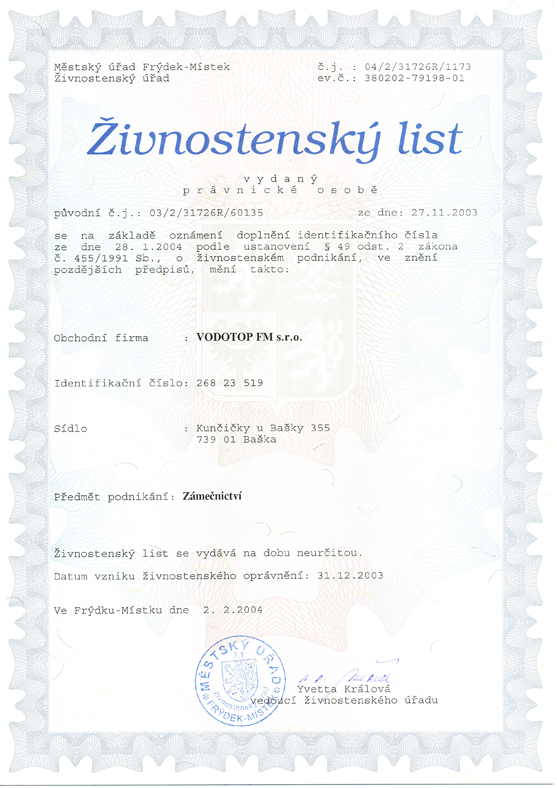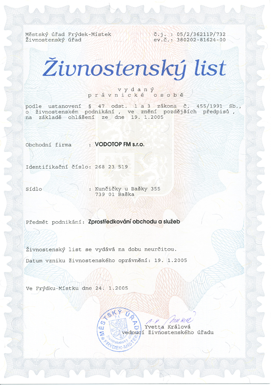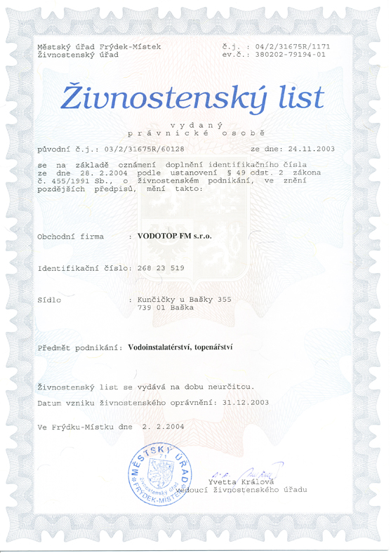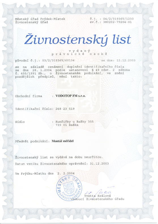 Protokol o počáteční zkoušce typu 70F,100S,50Z,150Z - VODOTOP FM s.r.o